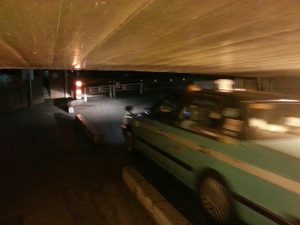山手線、京浜東北線、東海道線、新幹線と下をくぐり、ようやく出口が見えてきます。低いまま上り坂になるので、ここは本当にぶつかりそう。ちょうどタクシーの写真がありました。