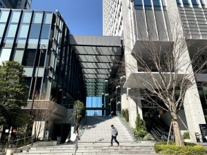左側のビルが品川シーズンテラスです。このビルの中を通り抜けて港南エリアの道路へアクセスできます。右側はNTTドコモのビルです。横から見ると分かりづらいですが正面から見ると奇抜な形をしてます。高輪ゲートウェイ駅周辺の再開発区域の住宅棟
