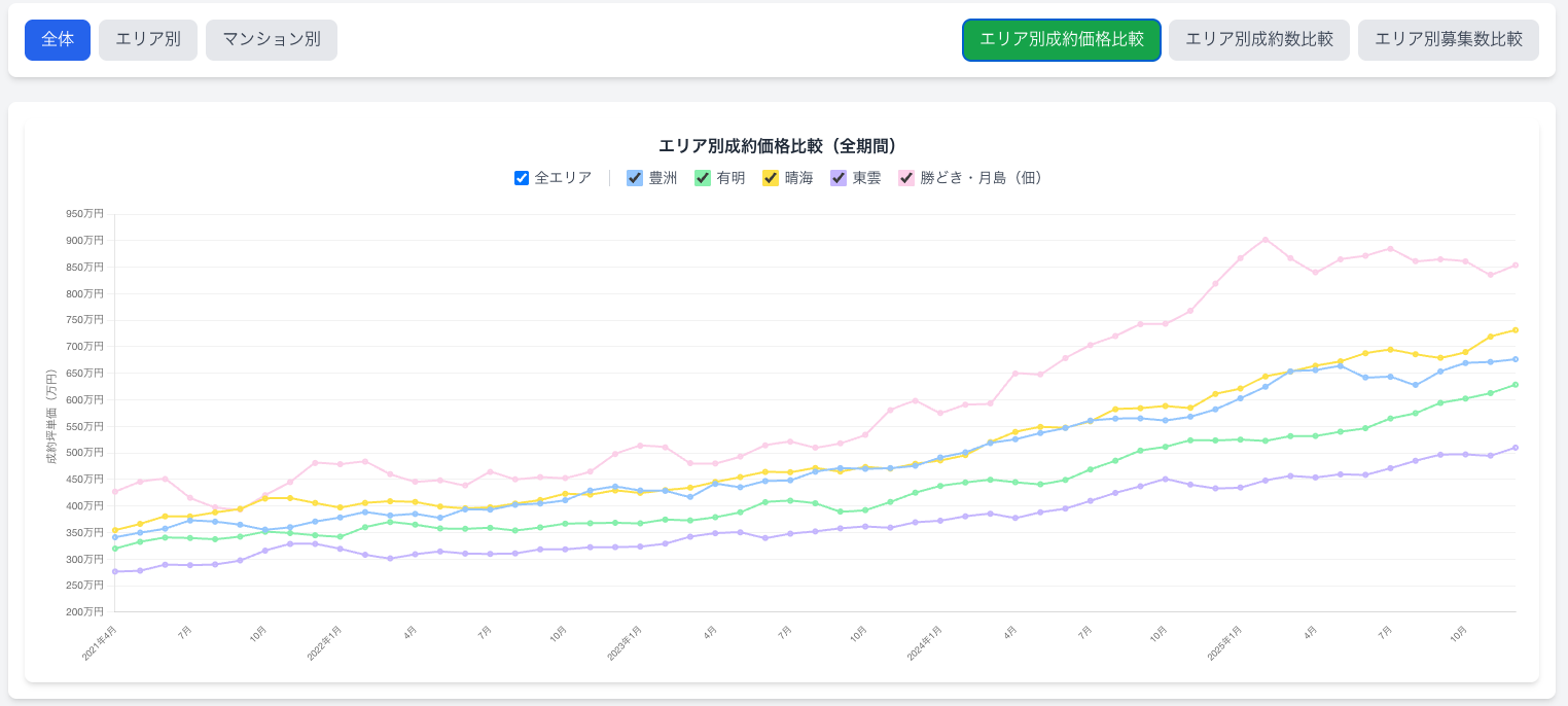 新築の供給がある有明/晴海エリアの価格上昇はわかりますが、そうではない東雲エリアが同列2位という点は驚きです。