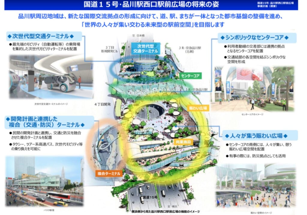 国道15号(第一京浜)の上空に巨大な歩行者デッキが整備され、駅から高輪エリアへ信号待ちなしでアクセス可能になります。