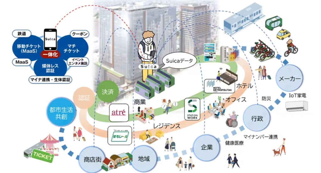 オフィス入館時にSuicaをタッチすると、近隣の商店街で使えるクーポンが届くなど、巨大施設と既存の街をデジタルでつなぐ試みです。
