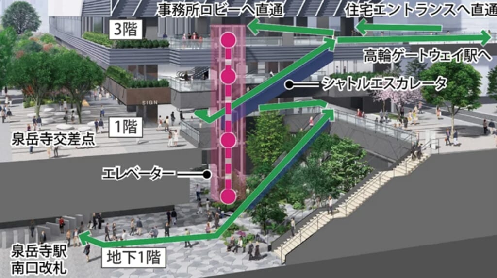 高輪ゲートウェイシティにペデストリアンデッキで、泉岳寺にはエレベーターで駅直結という最強のスペックを持ちます。