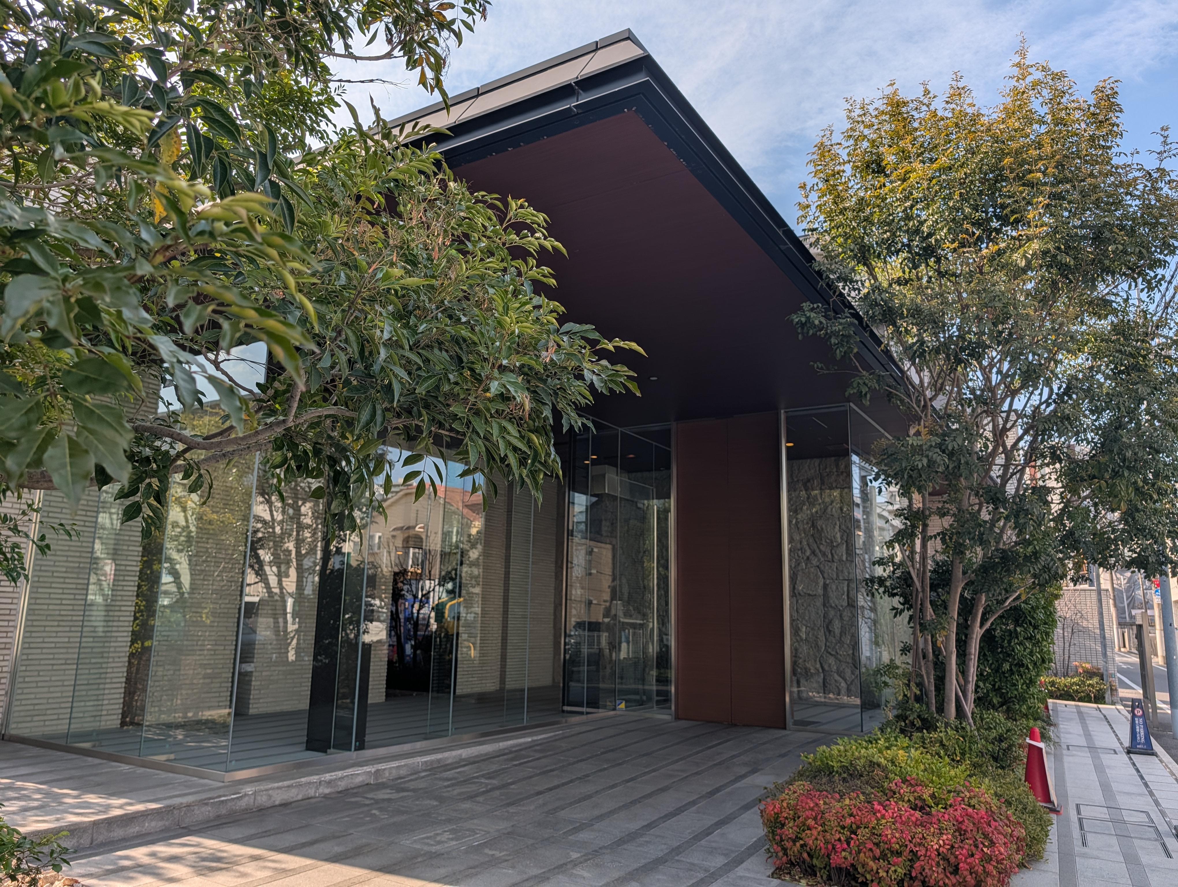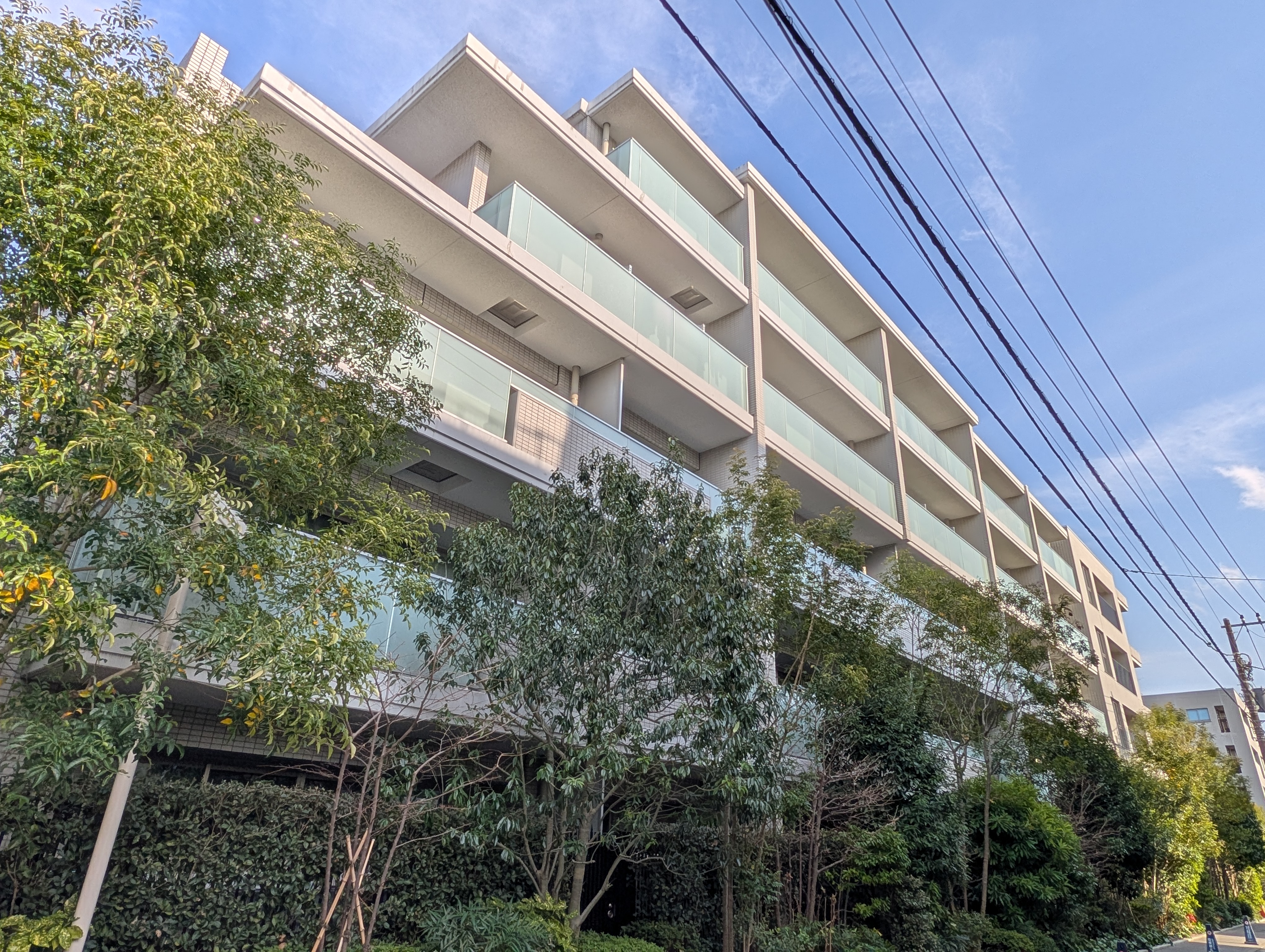 屋敷公園~フォレスト~テラスへと続く緑豊かなアプローチ、そこにガラス面豊かで大庇が伸びた素敵なエントランスホールがかなりスペシャルなものとなっており低層系がお好きな方にビシッとハマるランドスケープ&外観デザインになっています。